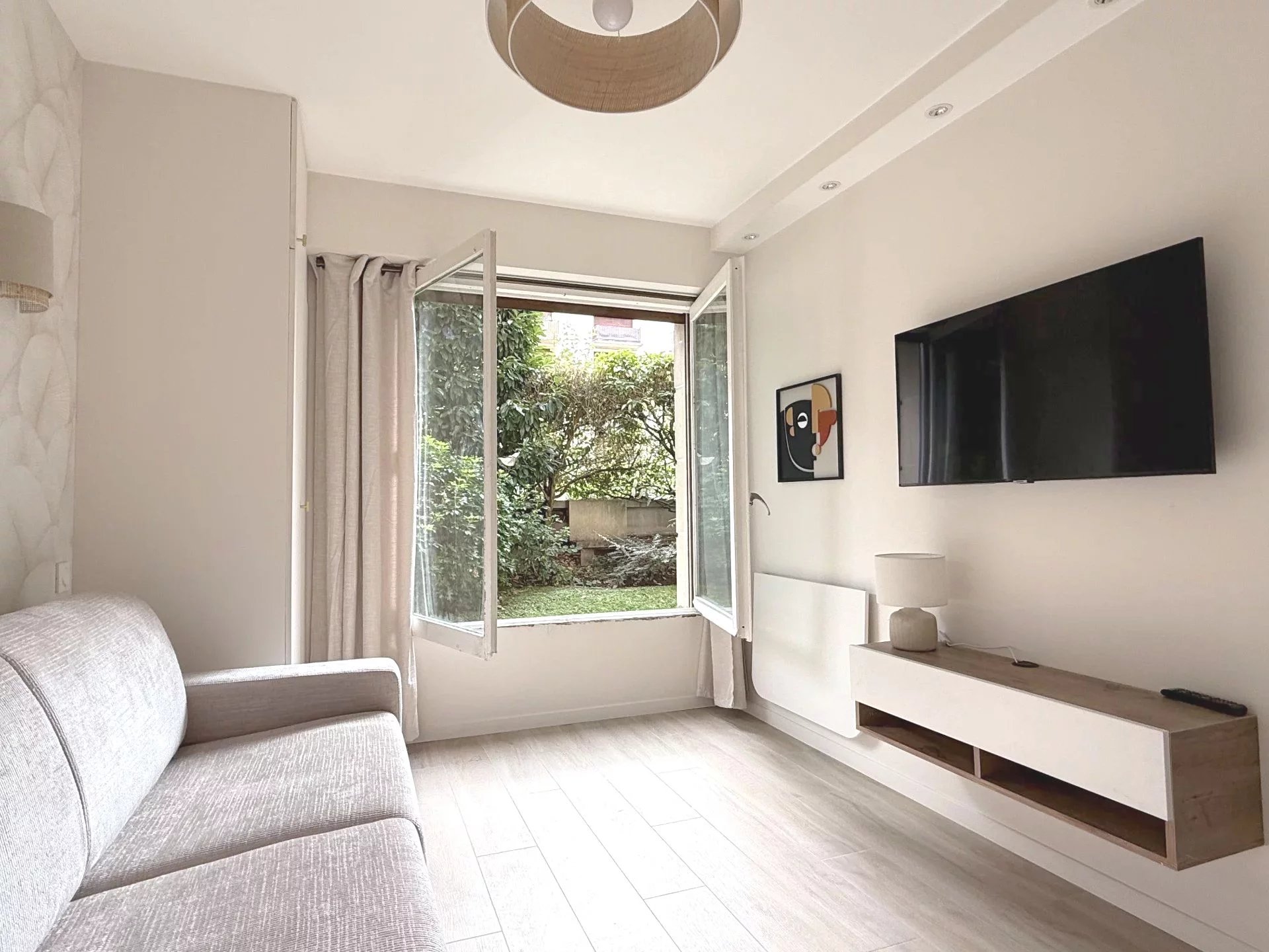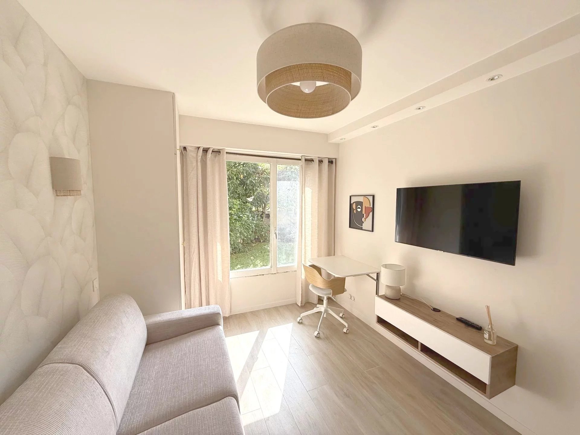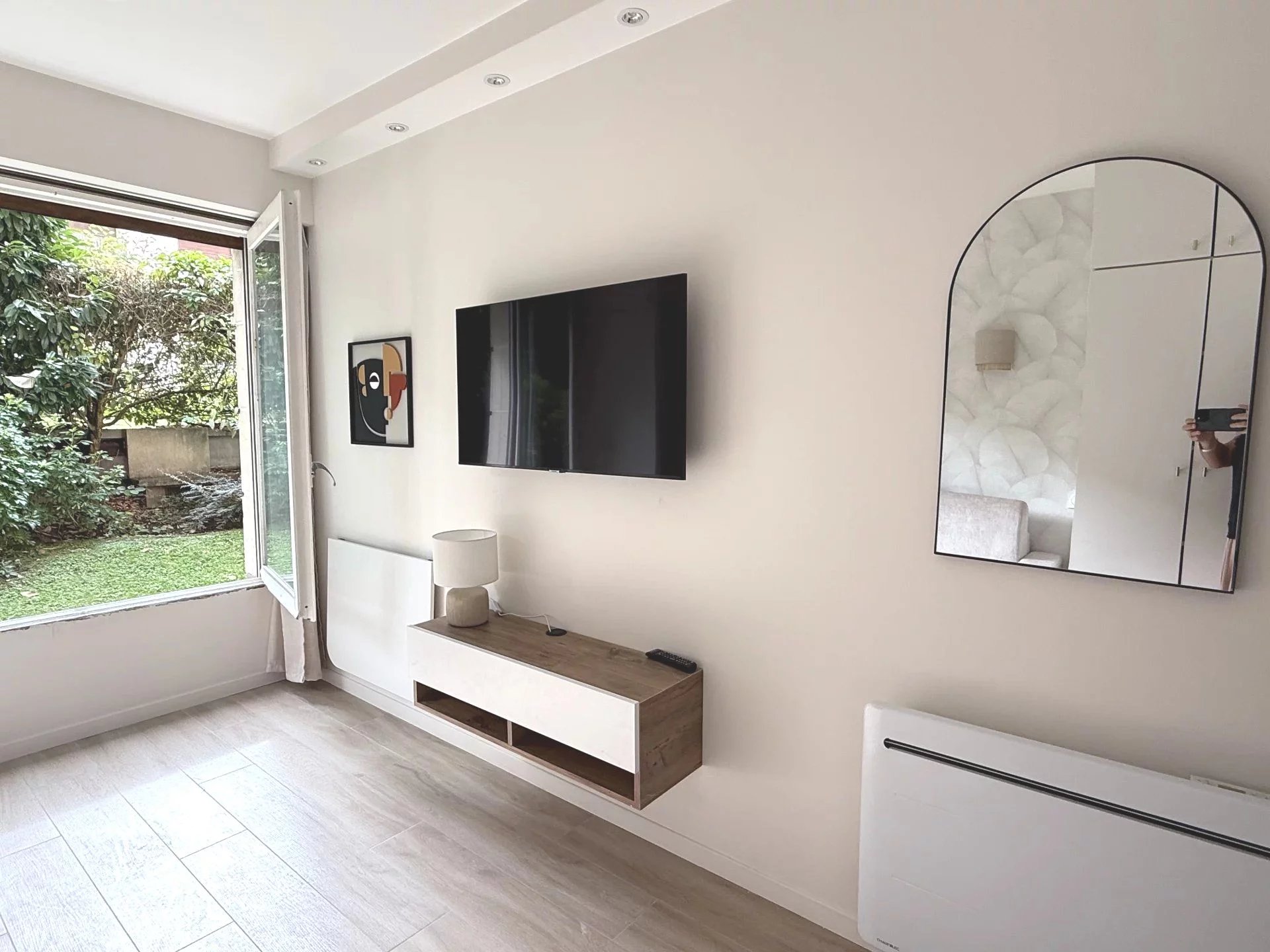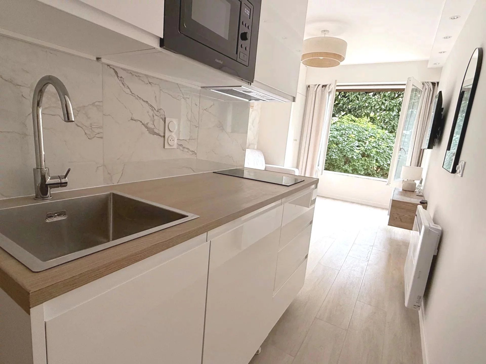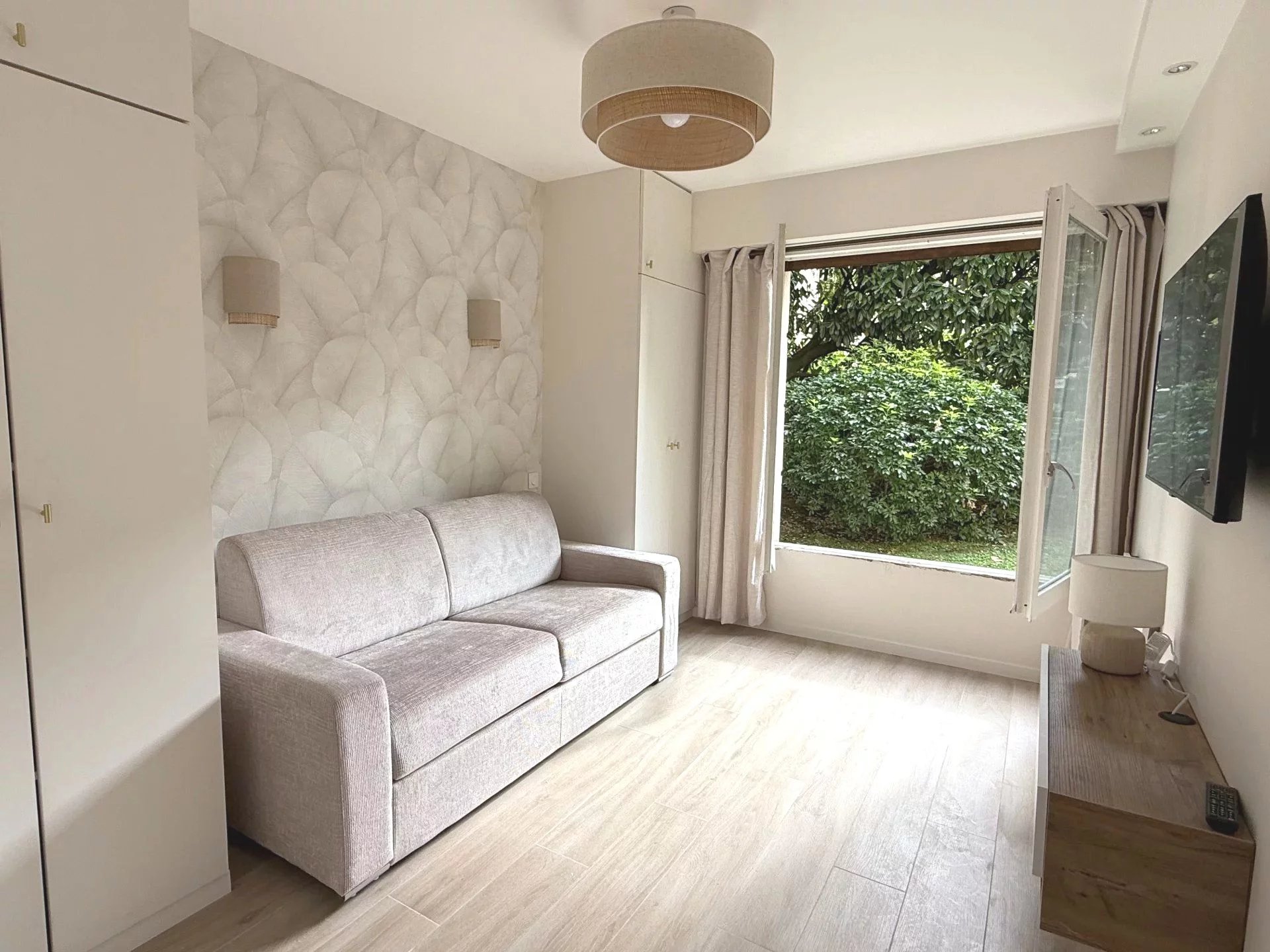 SAINT_CLOUD: Quartier Les Coteaux/ Bord de Seine, dans une résidence arborée sécurisée avec gardiens, Superbe studio meublé de 16,2Om2 entièrement refait à neuf en rez-de-jardin, au calme et vue dégagée sur espace vert sans aucun vis à vis.