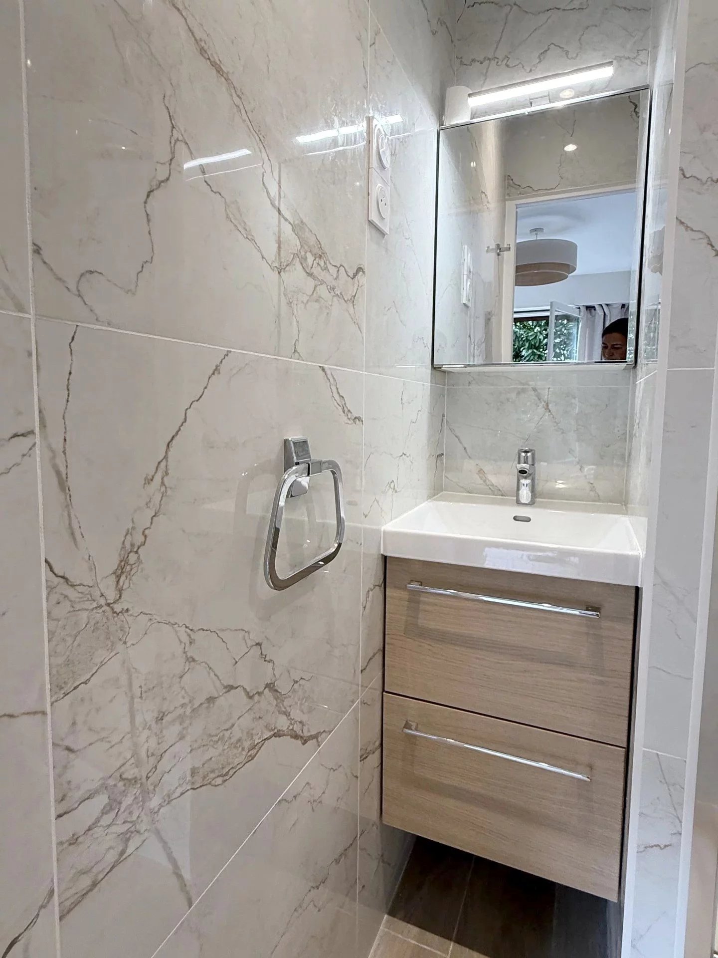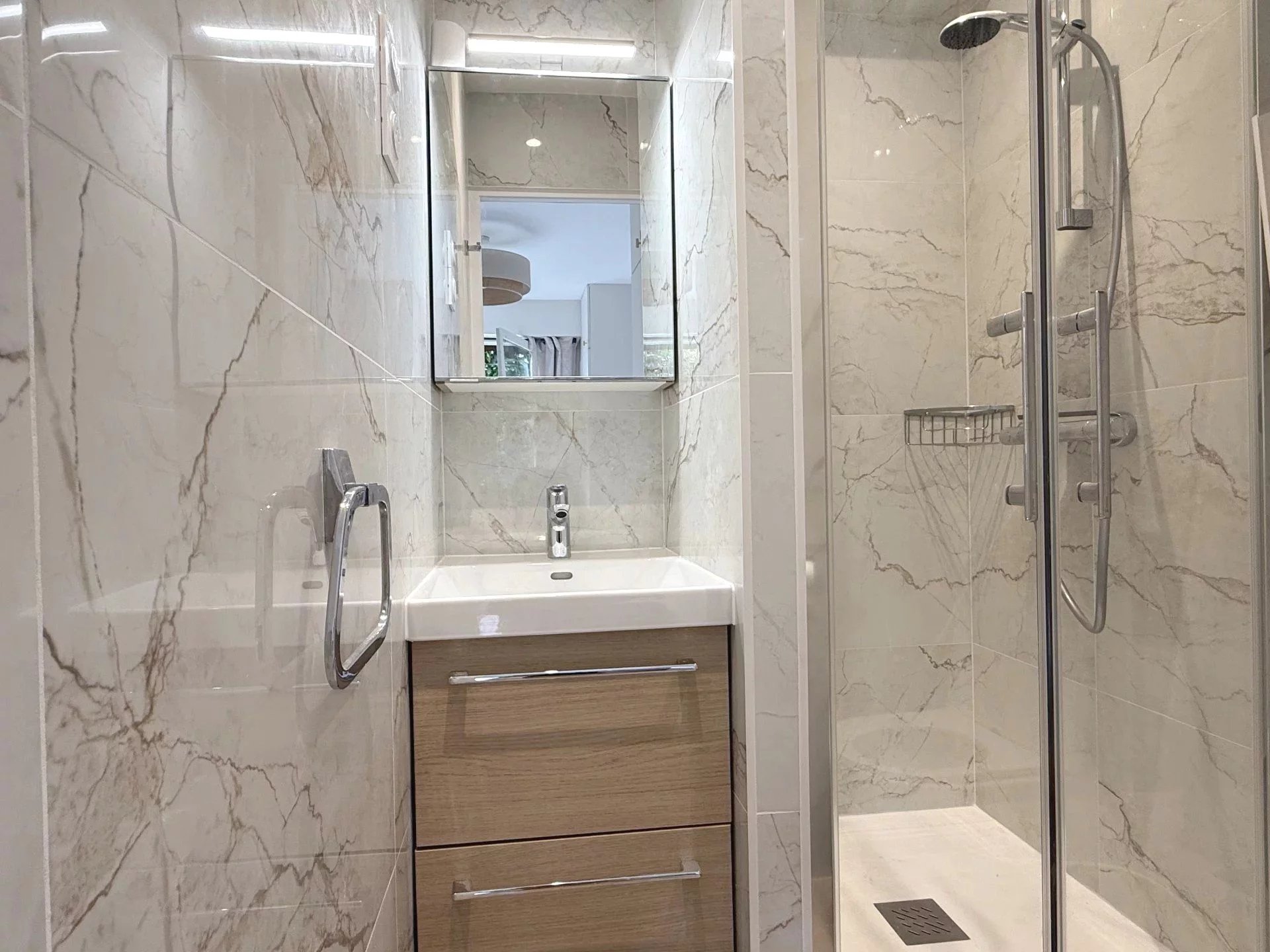 Un agréable séjour lumineux donnant sur jardin disposant d'un très bon canapé lit pour couchage régulier, d'un grand TV LCD, deux grands dressings sur mesure, d'une table relevable pour les repas ou travailler, d'une salle de douche avec vasque comprenant une petite machine à laver murale et des toilettes suspendus.